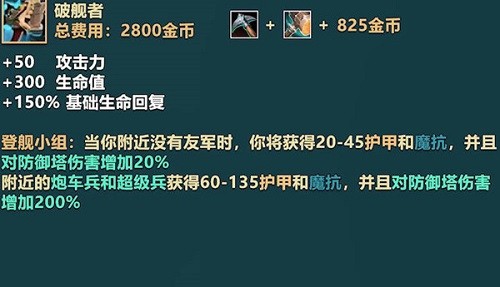 1:破舰者这个装备是专门提供给续航能力和分推能力的英雄设计的,当你的附近没有玩家的时候就会获得额外的护甲和魔法抗性,还可以对建筑造成更高的伤害,就是防御塔,可以更快的拆除防御塔;