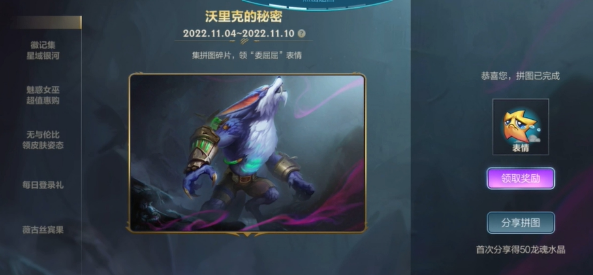 4、拼接完成即可领取到表情奖励,首次分享活动还可以领取530的龙魂水晶以及委屈屈的表情。