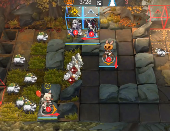 如图所示部署煌(向左)→ 山 → 伊芙利特(向右)→ 克洛丝(向下),山技能好了就开就行。