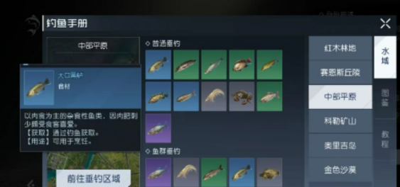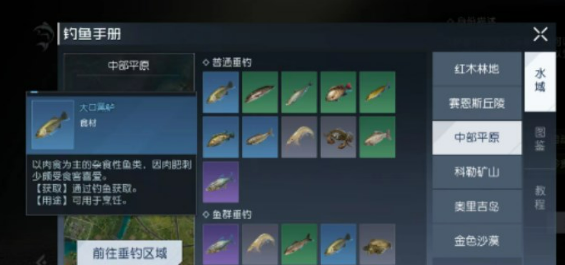 2、在钓鱼手册的中部平原、科勒矿山、金色沙漠中找到大口黑鲈,然后点击左下角的【前往垂钓区域】;