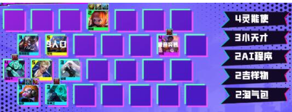 2、羁绊:4灵能+3小天才+2AI+2吉祥+2淘气包+2爱心使者+2福牛+2秘术+2黑客+1平民