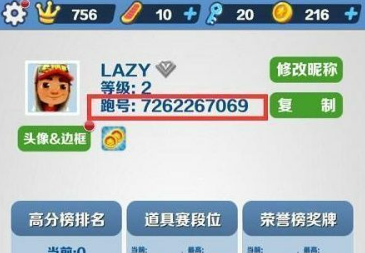 2、然后在个人信息页面找到下图中的跑号,点击右侧的复制就能获取地铁跑酷首充ID。
