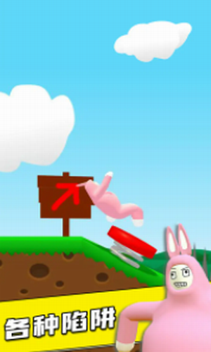 3、这个过程中,玩家需要控制兔子人越过悬崖,横跨地刺,一路躲避种种恶搞的机关陷阱!