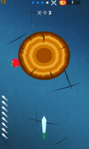 2、那么就过关了,在游戏中,间或在树轮上有苹果,如果飞刀可以插到苹果,那么会有额外的得分哦。
