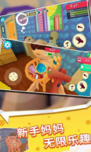 玩家在游戏中,可以体验辣妈的一天生活,收拾家务的同时,还要将宝宝照顾好,才能成为一个合格的母亲,玩家需要体验,从早上到中午到晚上的全部日常生活。同时,还要把家里的卫生以及宝宝的吃喝照顾好,才可以完成任务。