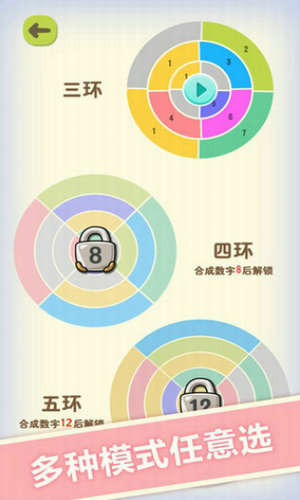 2、数字魔方游戏分为三个难度,3环,4环和5环,玩家需要循序渐进的通过才可以到下一个难度。