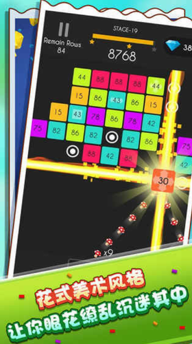 物理弹球:按住屏幕水平拖动手指,调整射击方向,瞄准目标后放手发射所有等待中的弹球,轻松击碎所有砖块!阻止砖块到达底端极限线;