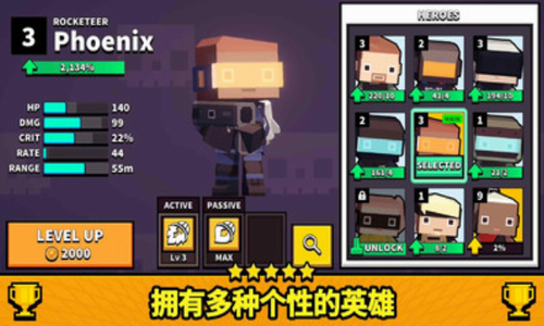 玩家选择可爱的公仔方块像素角色,然后进入无尽战场来进行战斗;