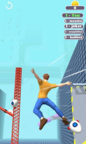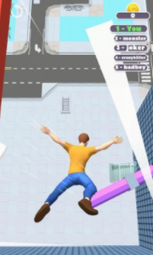 将模拟从高空坠落的过程,让我们坠落是从一个非常高的楼顶上一跃而下,和你的对手们一起向下坠落,你要躲避降落过程中遇到的各种障碍,尽量不要被碰到,这样会减慢你坠落的速度,毕竟这场比赛中谁先落地谁才是冠军,如果你连前三都进不了就输定了。