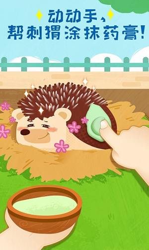 急救完成,给动物园的动物们做SPA护理一下!刺猬的刺掉光了,宝宝动手制作芦荟胶,涂抹在刺猬皮肤上,按摩吸收,长出新的刺。