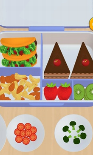 午餐盒准备是一个ASMR游戏,你把食物放在盒子里,你会有一种满意的感觉,而把食物项目的顺序。