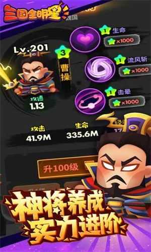 《三国全明星破解版无限元宝版最新版安卓版》是一款非常有趣的模拟养成了类手机游戏,该款游戏采用了精致的卡通动漫风格而设计,整个画面看起来十分的精致,其玩法有趣,游戏中海量的武将和道具供玩家来尽情使用,游戏中各种阵容玩家可以自行匹配,轻松即可暴打吕布。欢迎感兴趣的朋友下载。