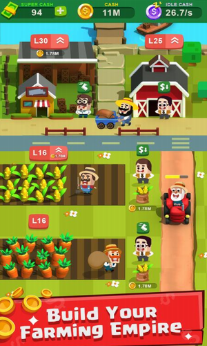 闲置农场大亨游戏是一款放置经营农场类游戏,玩家将在游戏中成为小小农场主,通过种植各式各样的蔬菜水果,不断赚钱并扩大你的产业,雇佣更多的人手加入农场,并合理管理他们,成为富有的大亨吧