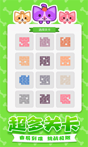数百个由易到难的关卡设计,开动你聪明的小脑瓜,带领可爱汪汪一笔走完所有格子吧!