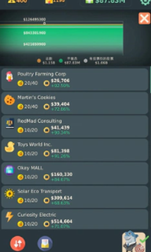购买最有前途的初创公司的股票 - 获得股息并创建国际控股公司!股东大亨破解版这是一款模拟经营的手游,让每个玩家都能真实的感受创业的生活,更多精彩的玩法都可以在线尝试,玩家经营的是一家公司,需要想方设法在每个城市都需要开发更多赚钱的项目,这样才能让自己的收益变得越来越多。走上人生的巅峰,开启你的全新认识,从最初的阶段,是要慢慢的进行打工的,不过可以一步步的完成更多的目标,这样就可以创办自己的公司,打造属于你的商业帝国,相信这会很不错的事情,也是无比精彩的过程哦!