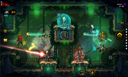 2、360°射击的平台动作游戏。像个真正的硬汉一样跳跃、冲刺、射击、斩击并把敌人炸上天吧;