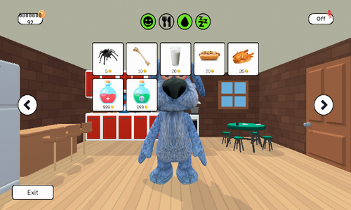 1、和巴勃罗互动,通过它的心情给它不同的物品,它会在场景中自由行动,陪伴你一起玩耍。