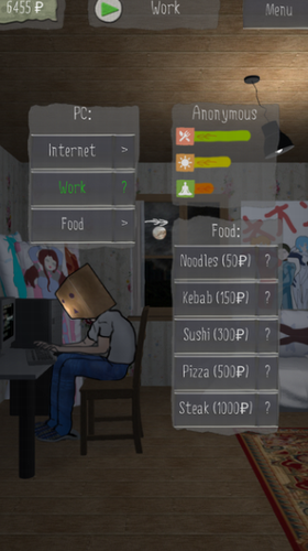 一款专为宅男打造的模拟生活游戏,玩家将化身为孤独的死宅,只有通过网络才能和外面的世界联系,通过赚钱来养活自己。为了取悦自己,你还可以买各种二次元角色抱枕和海报哦。