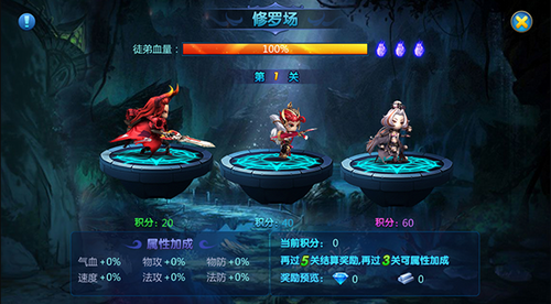 2:每过三关可消耗积分获得属性加成,每过5关可获得一个通关宝箱。
