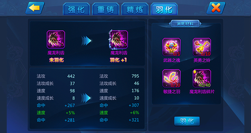 装备通过羽化可以获得更强大的属性,羽化需要消耗相应的道具,其中武器羽化需要消耗武器之魂,武器之魂是十分重要的珍贵资源。