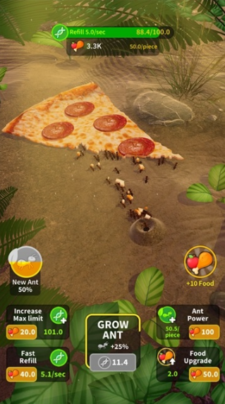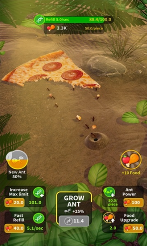 3、但当你在这款闲置游戏中一直吃下去,就会添加更多的蚂蚁到你的群落。