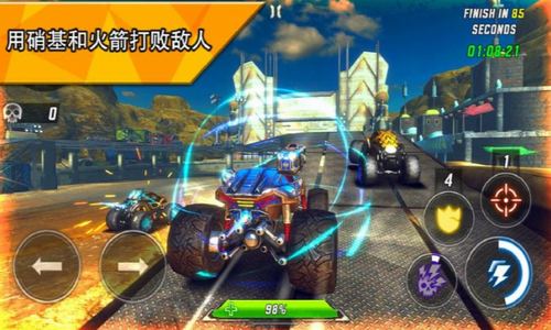 在这里获得更多的金币去自由改装升级你的赛车。极限火箭汽车竞技场破解版是一款画面效果极其酷炫的汽车特技比拼游戏,这次你将驾驶汽车进行实力的比拼,不止是竞速那么简单,每个车辆都是经过特殊改装的,可以发射各种强大的武器,安装各种强力的武器系统,在竞技中不断的使用各种武器攻击对手,不择手段成为一个到达终点的车辆,感受过瘾的街机色彩和玩法模式!下载极限火箭汽车竞技场试一试吧!