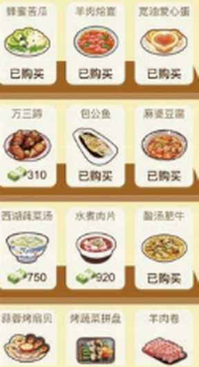 1、超多菜谱,达成相应的成就就能解锁,还能通过钞票购买高级食材。
