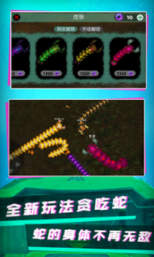 在大家记忆当中贪吃蛇的方式上加入新鲜的玩法,超多个性皮肤等你来解锁,虽然游戏当中皮肤酷炫丑萌,但是类型却非常丰富,你可以有很大的空间来选择,多种主题自由切换,不管玩多久,视觉上不会感觉疲劳。