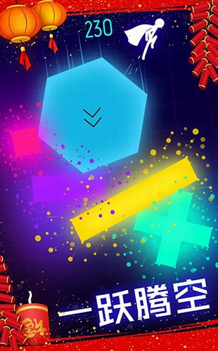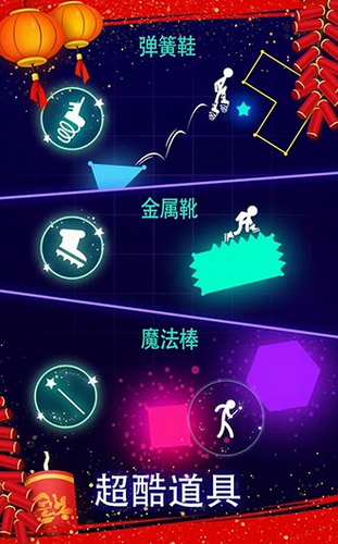 1、火柴人不断的前进和跳跃穿梭在翻转的霓虹形状的物体之间,同时去滑动点亮他们。