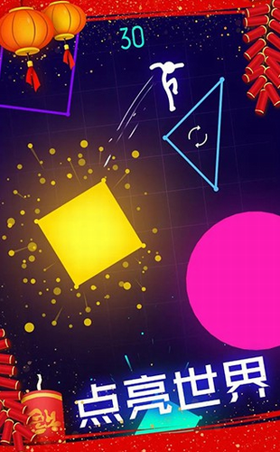 3、在霓虹形状的物体间翻转跳跃来点亮它们,收取星星来提高你的分数,点亮整个黑暗的世界。
