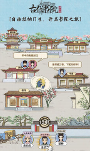 1、模拟古代开书院的休闲游戏,在游戏里,你可以自由招收资质各异的门生;