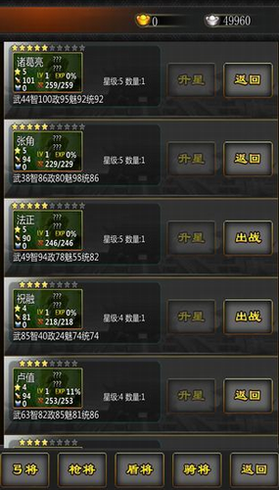 3、五星红将是这个游戏目前版本中的最强武将,你的目标就是将所有的战斗武将品质都提升上去。
