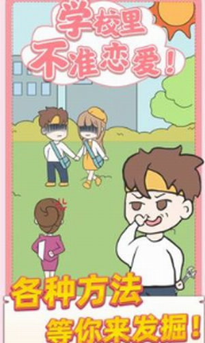 真是叔可忍,婶婶不可忍!今天,我一定要拆散你们。校园不准恋爱免费版是一款模拟的游戏,校园不准恋爱的画风整体是卡通的,玩家需要从最开始的时候就想尽各种各样的不同的办法让里面的谈恋爱的人分手。在这里要面对众多的情侣们,看见任何的任何都要想办法拆散他们。在校园中四处的游荡,将那些天天秀恩爱的人群统统打击一段,在这里体验轻松畅快的剧情内容。玩家也是沉溺其中的美好,当然此时坏人的你就出现了,你必须棒打鸳鸯哦,快来下载校园不准恋爱吧!