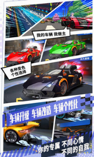 1、定制你的专属赛车,在青春洋溢的赛道上,尽情的体验飞驰的过程;