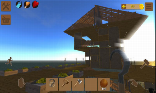 2、然后收集漂流而来的各种物资进一步建造自己的海上居所。